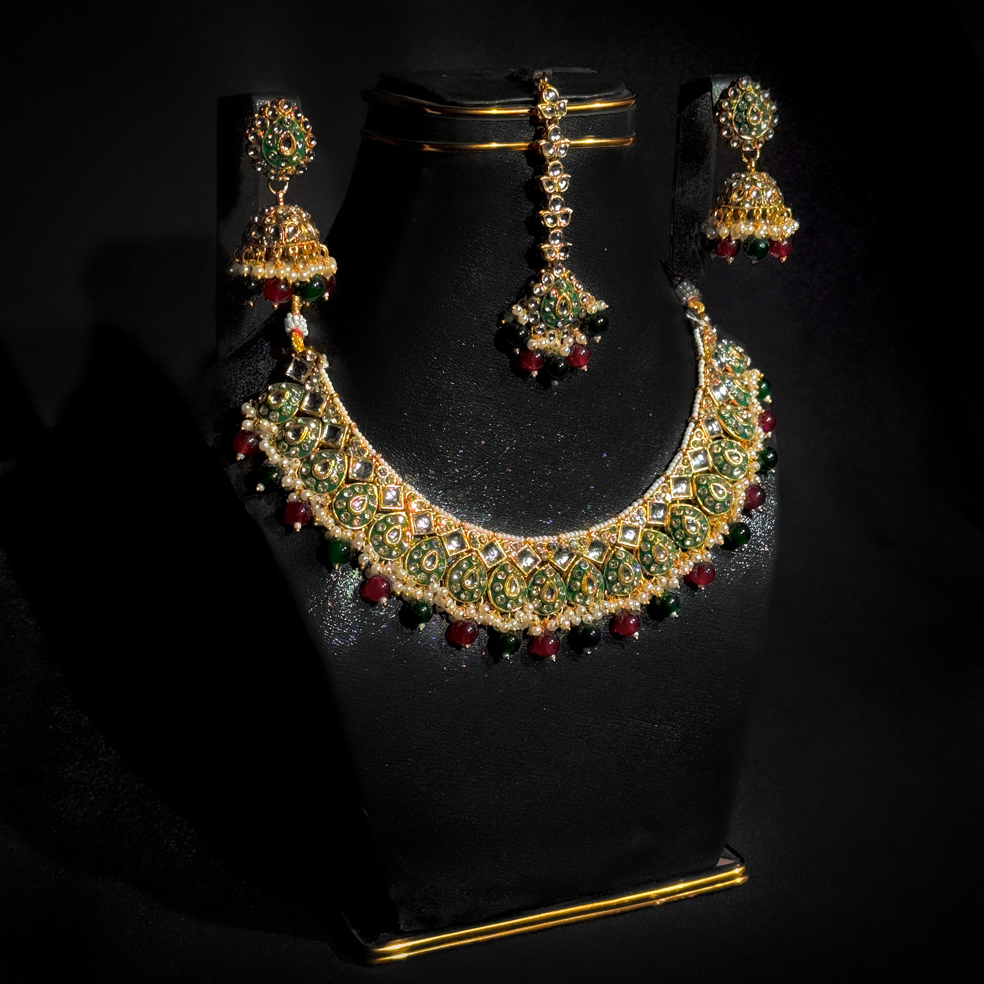 Add a regal touch to your look with our Amira Royal Kundan Necklace Set. Expertly handcrafted, this exquisite set features rich emerald-green and ruby-red stones beautifully arranged in intricate kundan work, enhanced with lustrous pearls and gold-toned detailing. The matching jhumka earrings and maang tikka complete the royal look, making it a perfect choice for brides, festive occasions, or traditional celebrations. This set embodies timeless elegance with a luxurious, heritage-inspired charm.