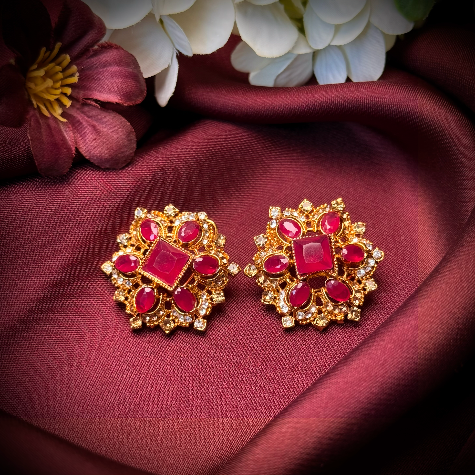Add a touch of timeless charm with the Crimson Zircon Studs. Crafted with precision, these floral-inspired earrings feature a radiant combination of ruby-red and clear cubic zirconia stones that sparkle beautifully against the glossy gold-plated finish. Made from premium alloy, they are both lightweight and comfortable for long wear—perfect for adding a refined accent to any outfit, whether for everyday elegance or special occasions.