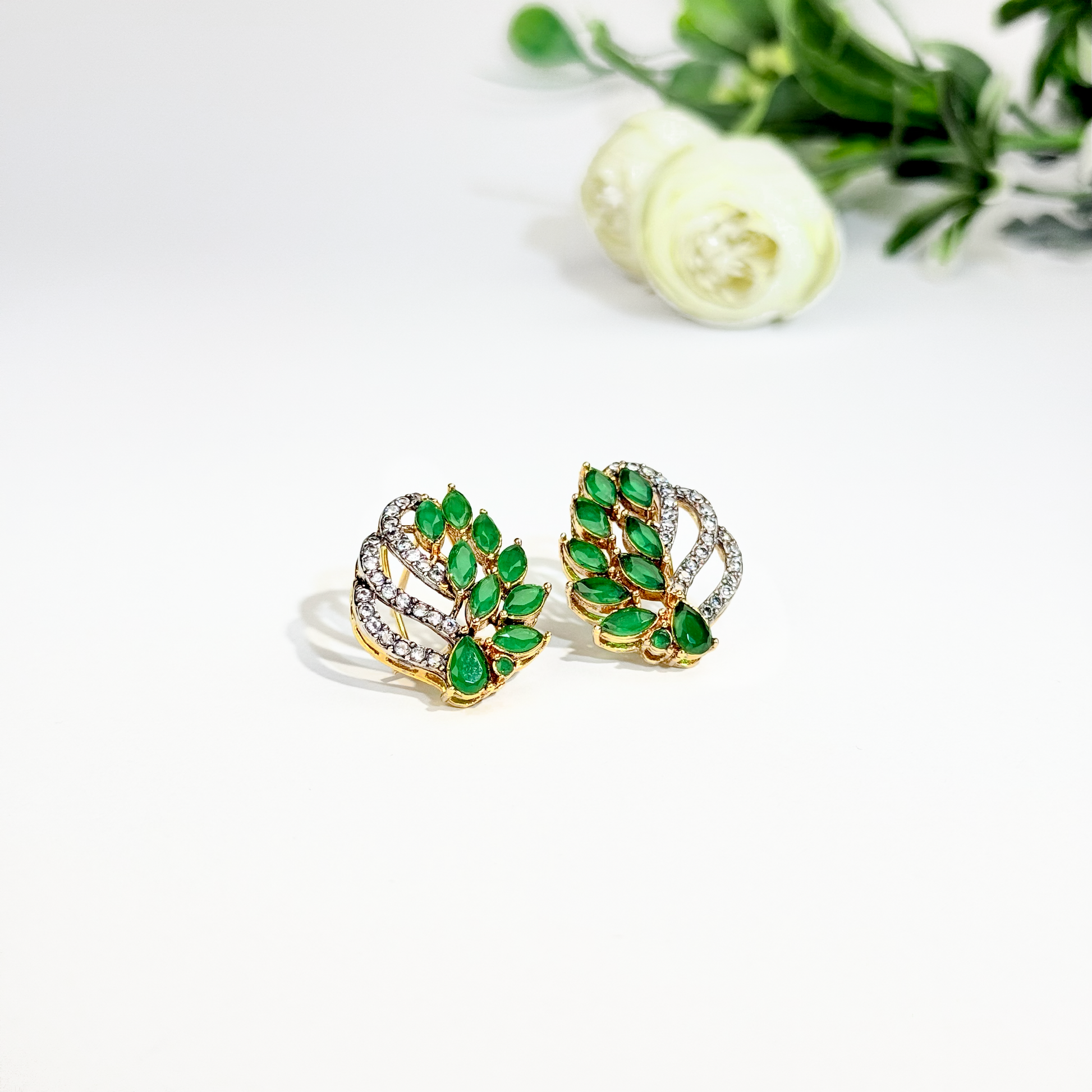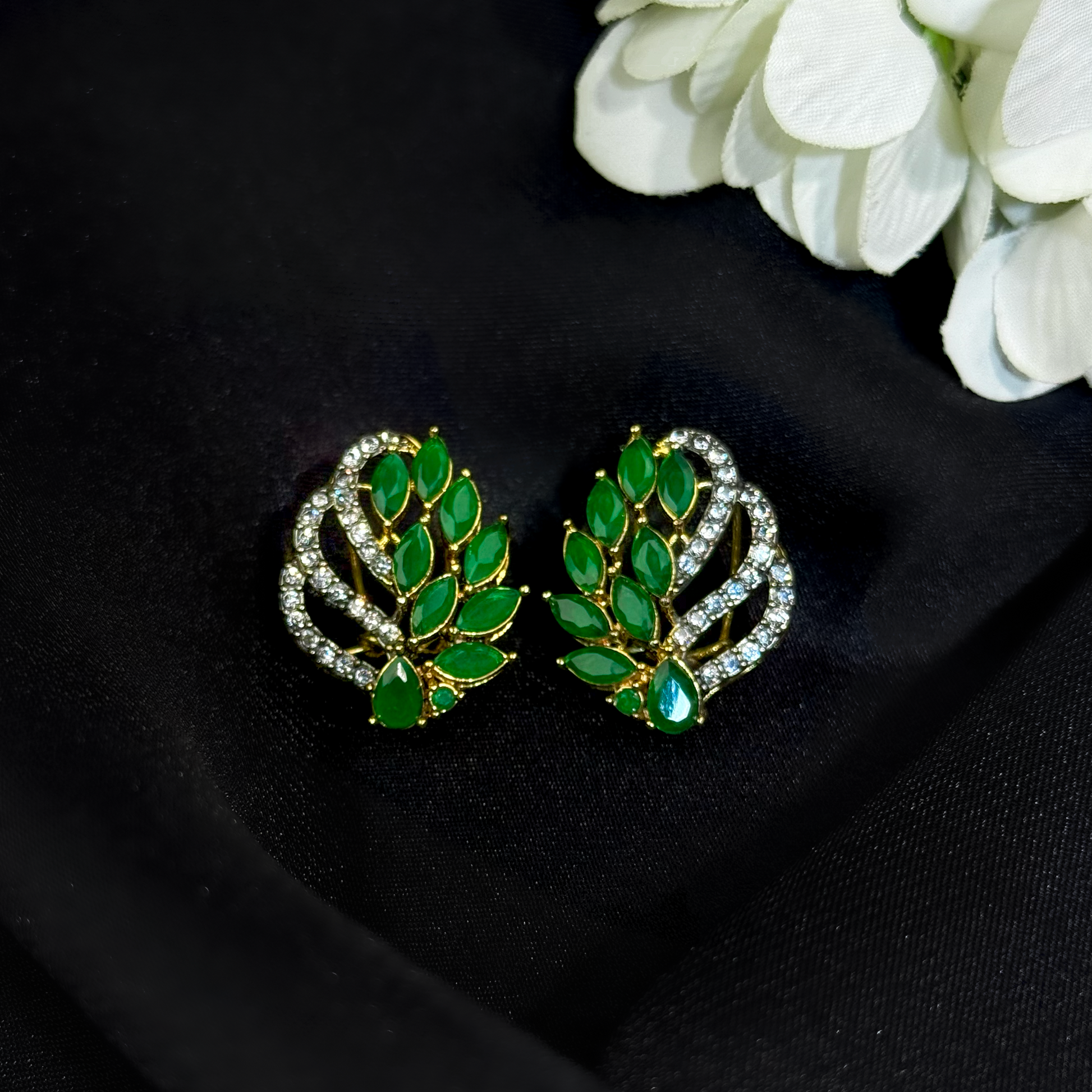 Bring nature’s elegance to your jewelry collection with our Emeralia Leaf Studs. Beautifully designed in a graceful leaf pattern, these earrings feature shimmering emerald-green stones outlined with sparkling white crystals on a gold-toned base. Their refined shape and vibrant color make them perfect for both festive occasions and sophisticated everyday wear.