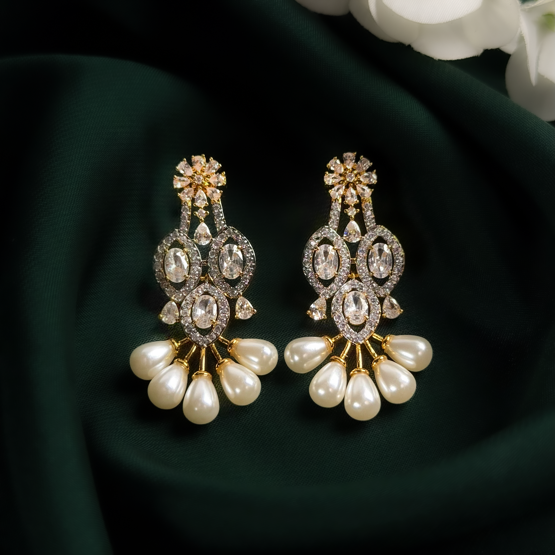 The Ethereal Pearl Glow Earrings reflect sophistication and delicate charm in every detail. Crafted with precision, these earrings feature glimmering clear stones arranged in an elegant teardrop pattern, accentuated by soft pearl drops for a timeless finish. Their versatile design makes them perfect for weddings, evening gatherings, or festive wear — effortlessly adding a refined sparkle to any look.