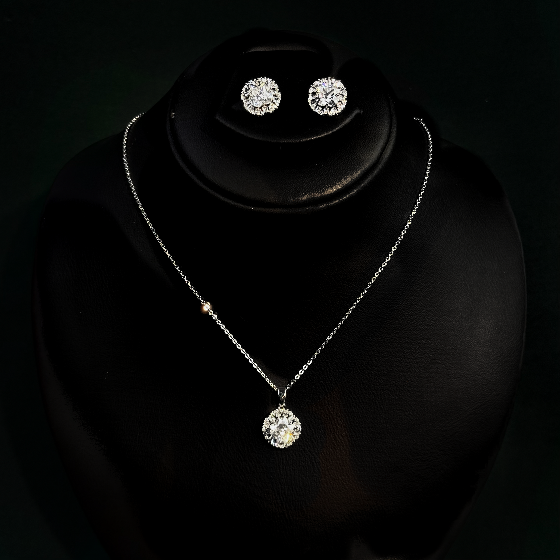 A timeless silver-tone necklace set featuring a stunning round-cut centerpiece surrounded by a sparkling halo of fine crystals. The matching earrings create a perfectly coordinated, high-shine look — elegant, classy, and ideal for any special occasion. A true must-have for brides, party wear, and gift giving.