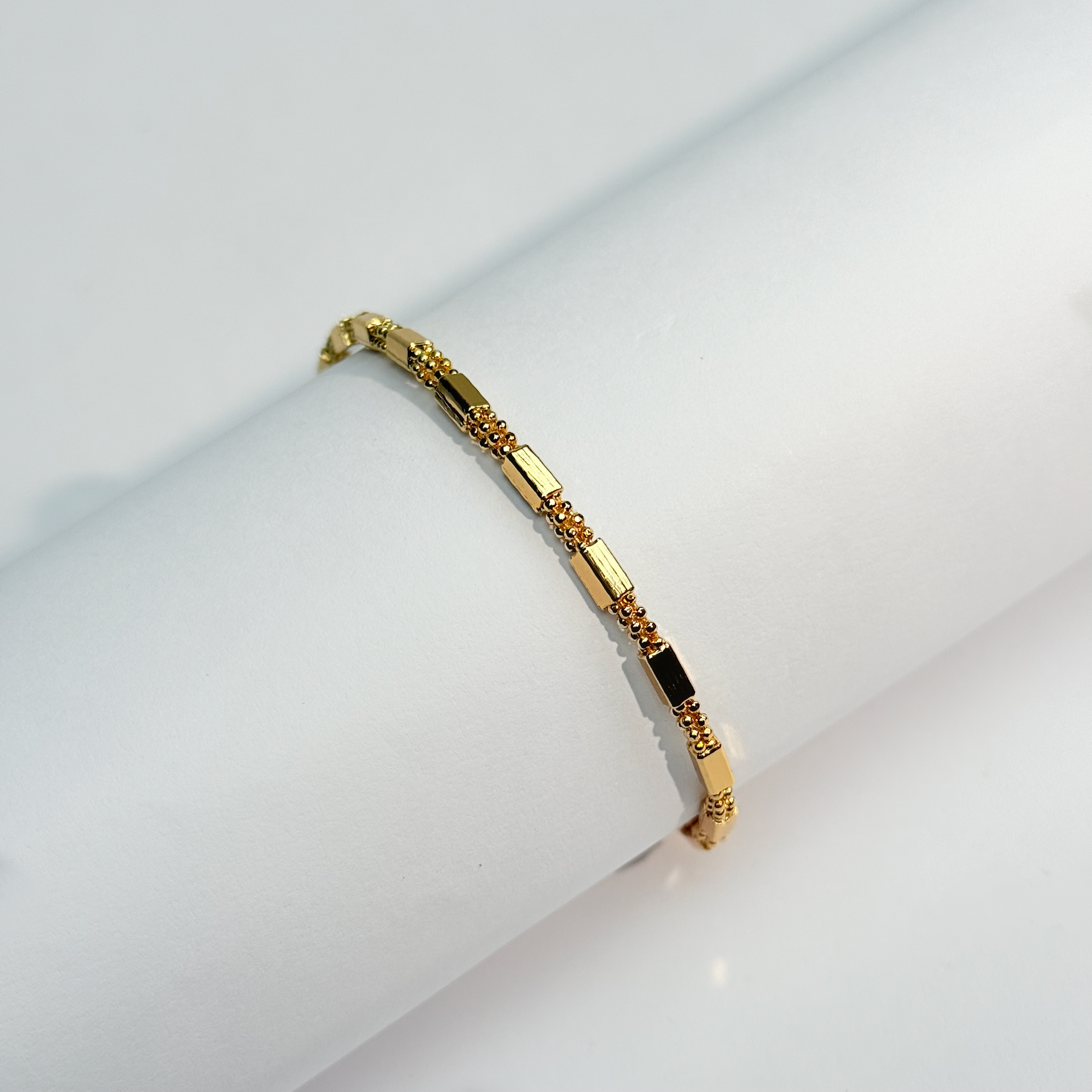 A sleek and modern gold-plated Anklet featuring alternating prism-cut bars and detailed bead clusters. Its reflective design creates a bold yet minimal shine, perfect for everyday wear or styling with your favorite accessories.