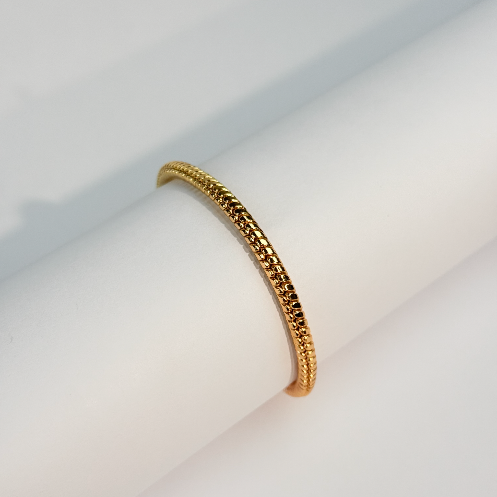 A smooth, high-polish gold-plated anklet designed with a sleek serpent-style pattern that shines beautifully from every angle. Minimal, modern, and effortlessly elegant — perfect for daily wear or stacking with other pieces.