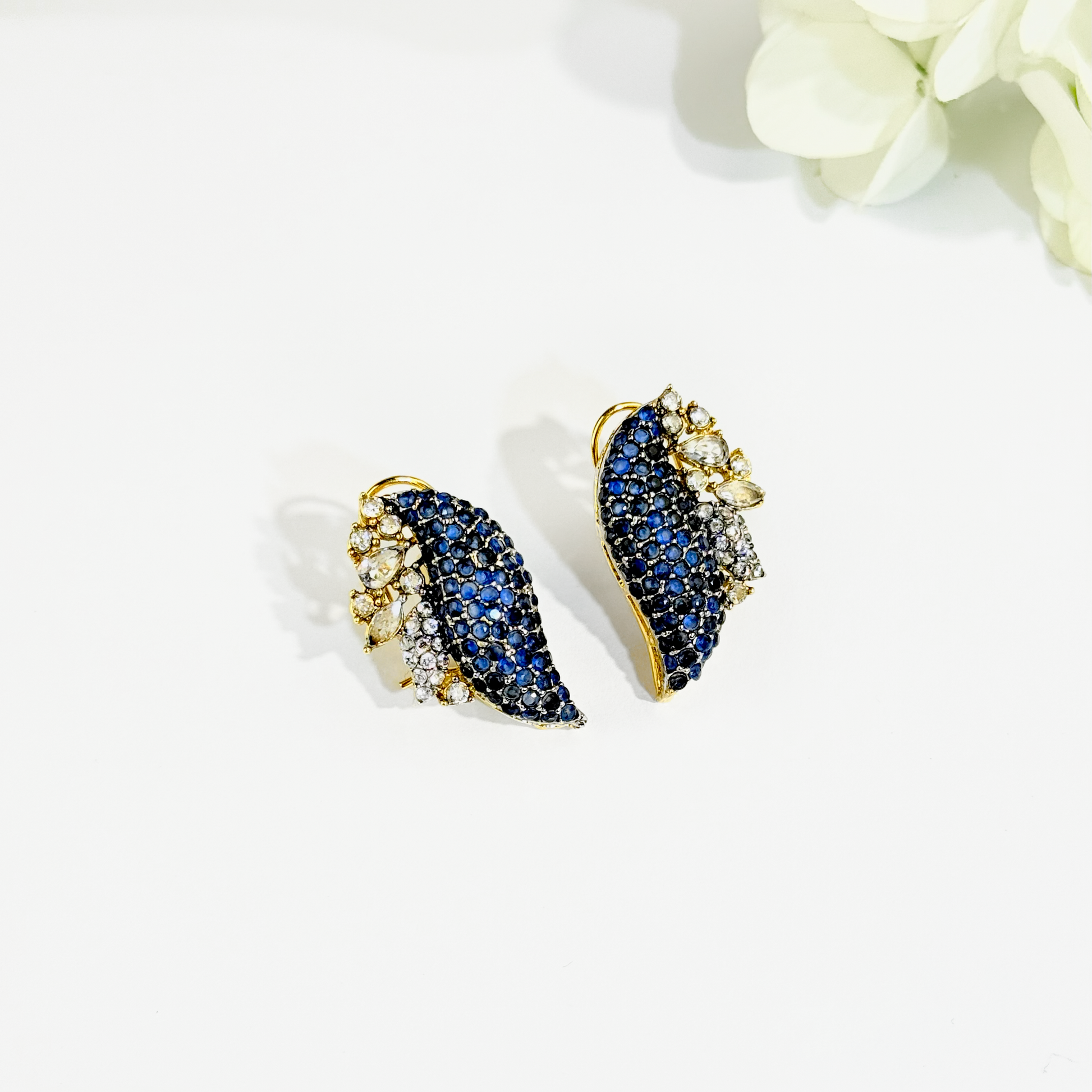 The Midnight Wings combine the charm of deep sapphire tones with the sparkle of crystal elegance. Inspired by the graceful curve of a feather, these earrings feature shimmering blue stones complemented by marquise-cut white crystals, all set in a radiant gold base. Perfect for elevating both formal and festive looks with a touch of luxury.