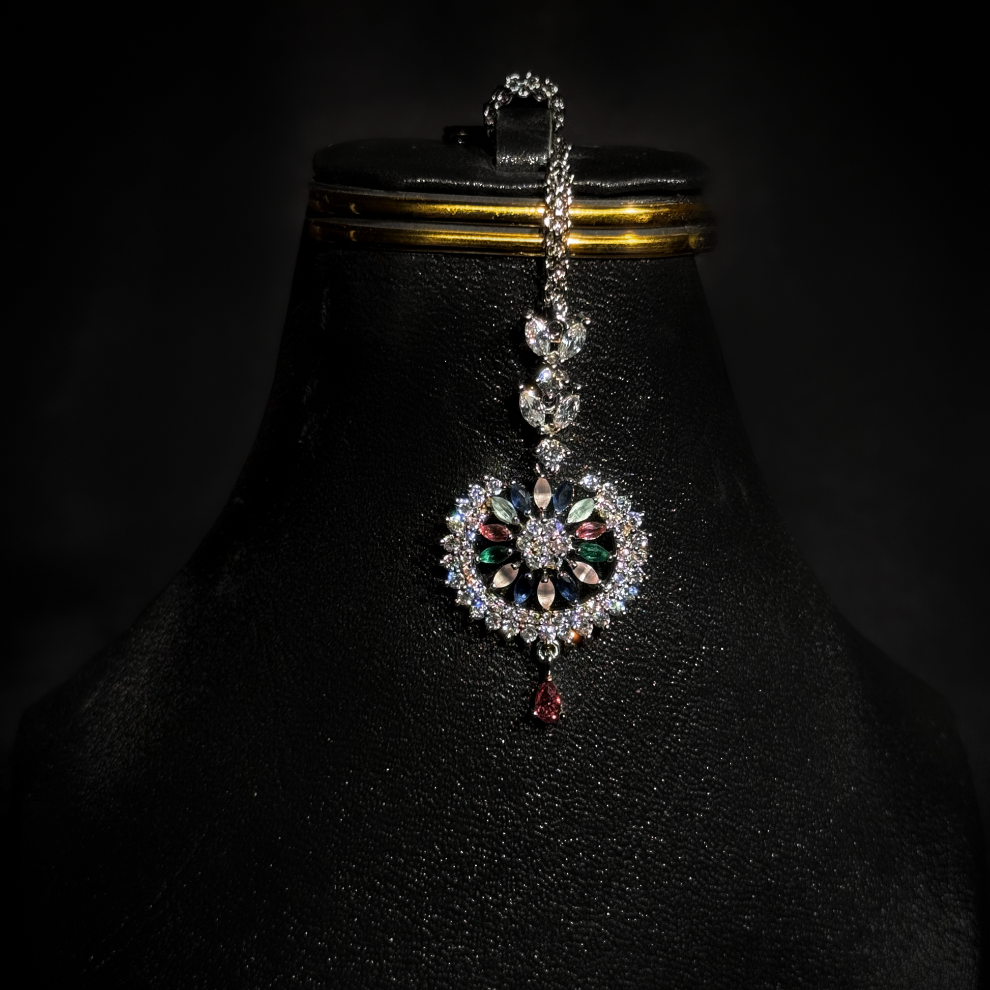 Radiate vibrant elegance with the Noor-E-Rang Teeka, a mesmerizing piece designed to add sparkle and color to your look. Featuring a stunning floral centerpiece adorned with multicolor zircon stones — green, red, blue, and pink — this tikka embodies festive beauty and timeless grace. Surrounded by a halo of shimmering crystals and finished with a delicate teardrop charm, it’s the perfect accessory for weddings, mehndi, or any traditional celebration.