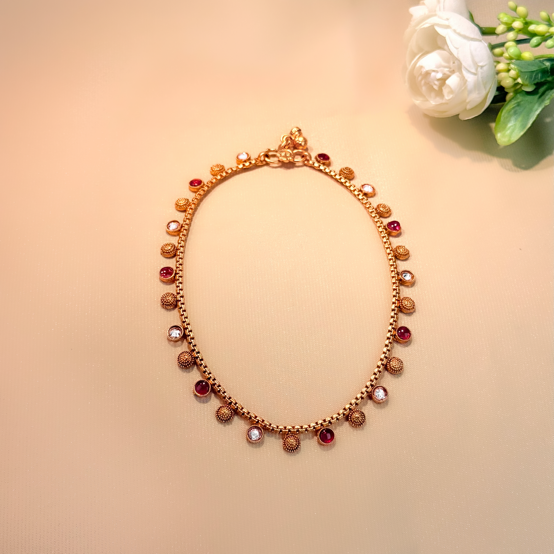 Indulge in elegance with Paro Pazeb, a meticulously crafted anklet adorned with stunning magenta, green and champagne stones. The intricate gold design exudes sophistication, making this anklet a demure addition to any outfit.