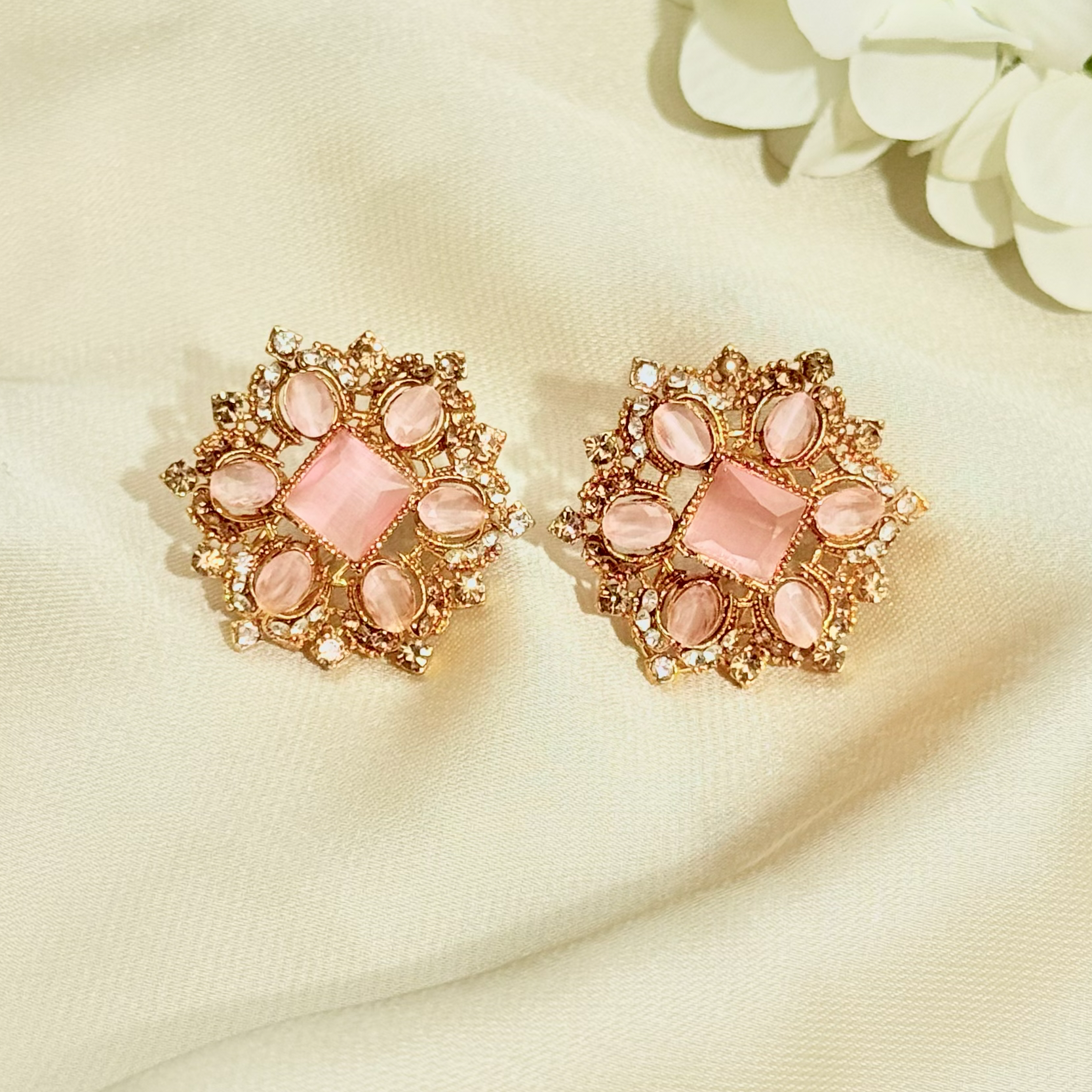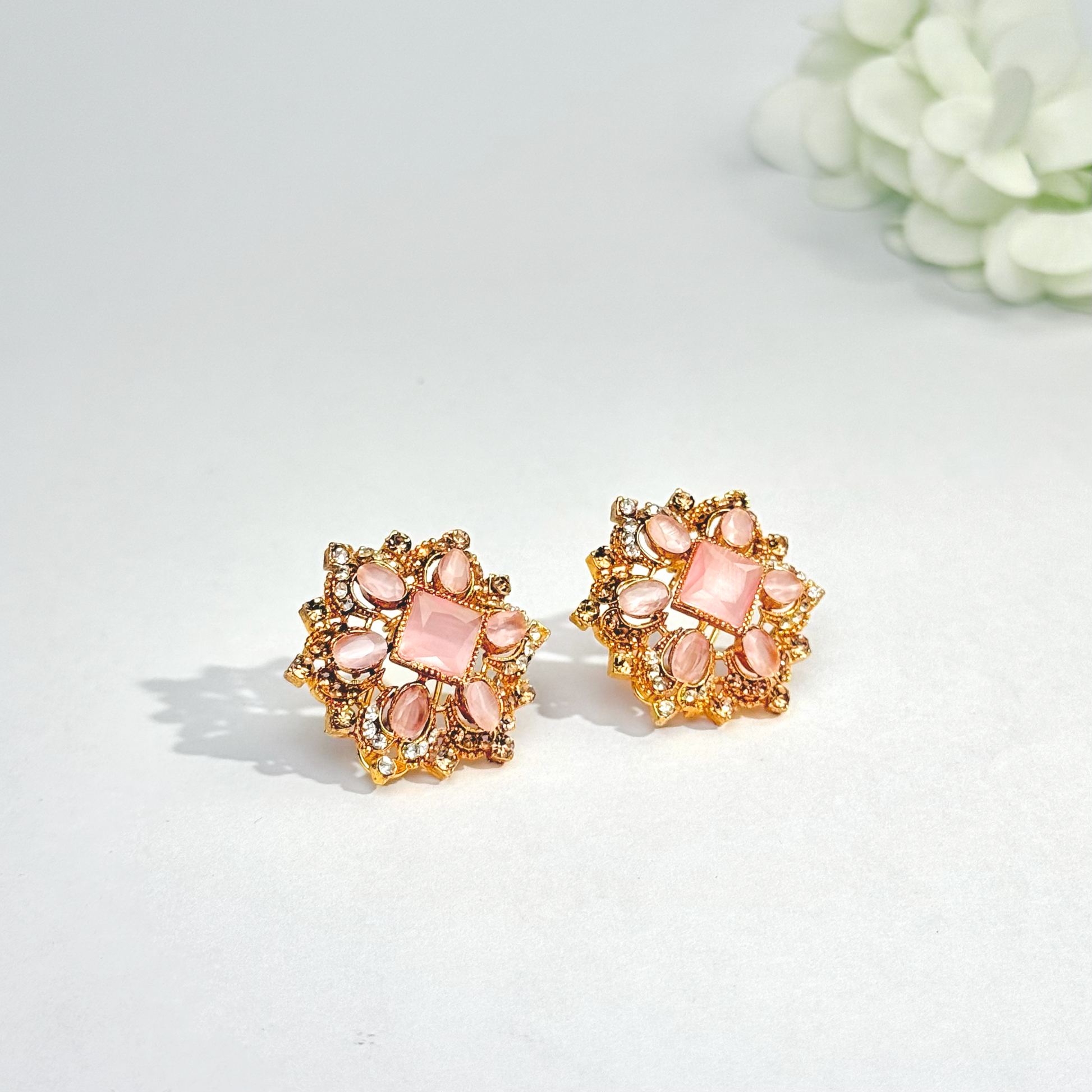 Embrace a soft and romantic charm with our Roselle Glow Studs. These delicate earrings feature a blush pink square stone at the center, surrounded by petal-shaped pink crystals and shimmering white accents. Set on a gold-finished base, the design exudes femininity, grace, and timeless sophistication — perfect for both festive occasions and elegant everyday wear.