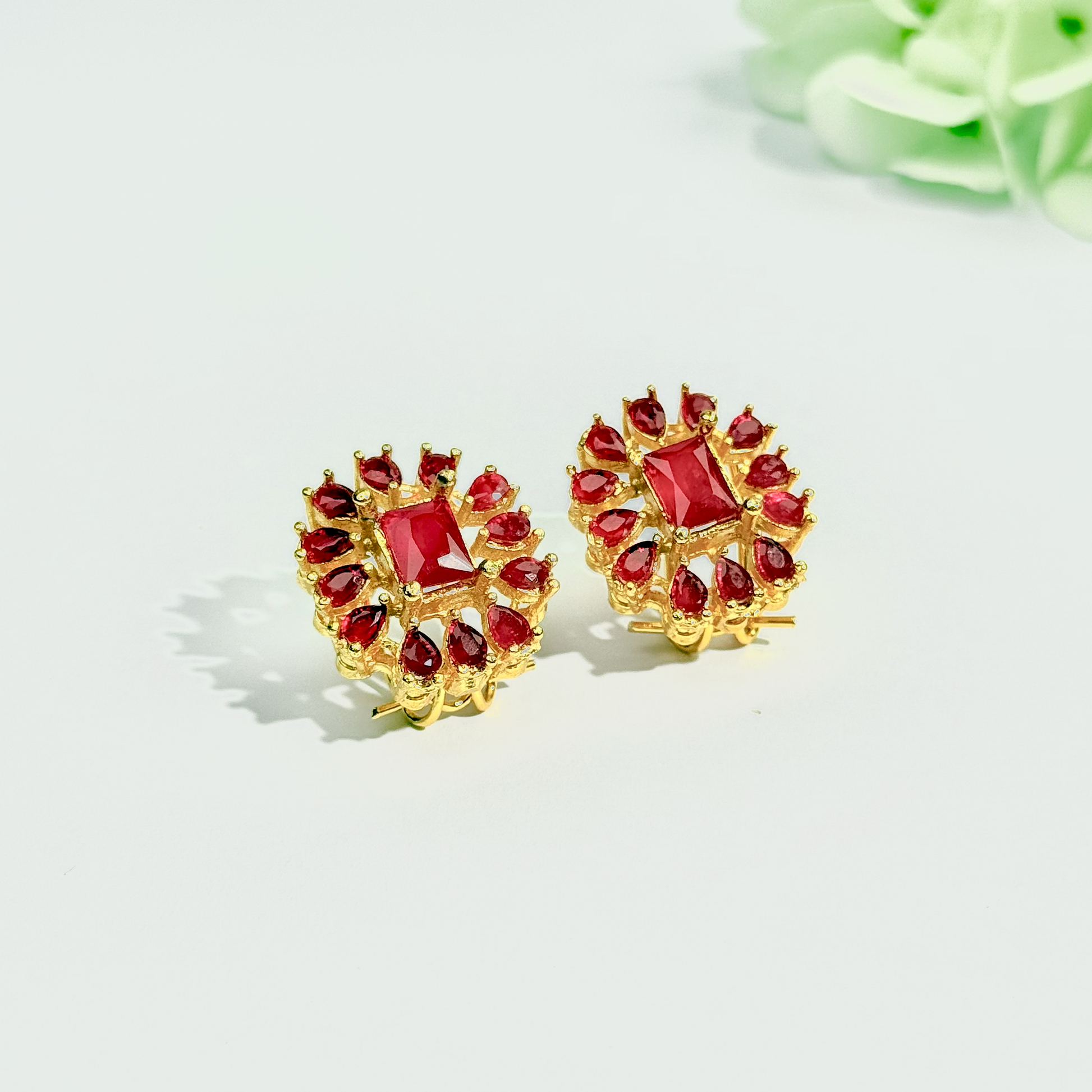 Add a bold and elegant charm to your style with our Scarlet Radiance Studs. These stunning earrings feature a radiant rectangular red centerpiece surrounded by a halo of petal-shaped ruby stones, all set on a rich gold-toned base. The intricate floral-inspired design reflects sophistication and luxury, making them a perfect choice for festive occasions, weddings, or evening events.