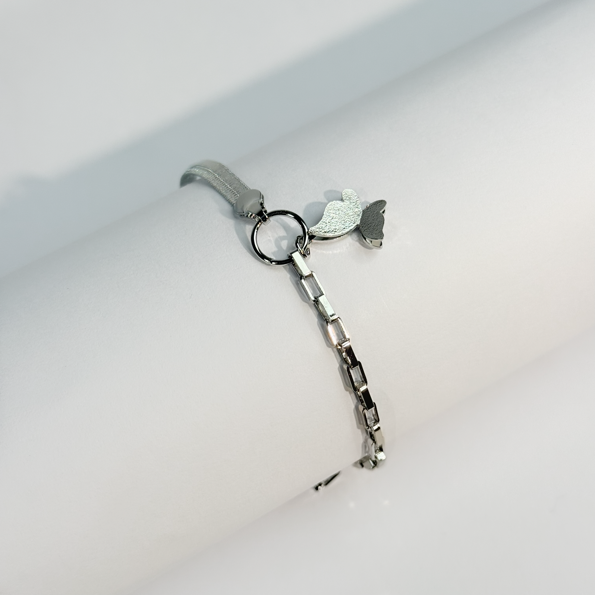 A graceful silver-plated Anklet featuring a sleek box-link chain paired with two delicate butterfly charms one smooth and one textured. Light, elegant, and feminine, this piece adds a soft touch of beauty to any everyday look.